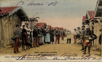 les CABANES TCHANQUEES, grandes maisons sur pilotis (les tchanques : les échasses) au milieu du Bassin, près de l'Ile aux Oiseaux.(1945/1948)