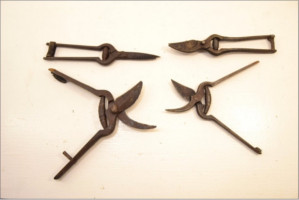 les CISEAUX (à vendange) : Sécateurs à lame fine, longue et pointue, à poignée évidée, légère pour couper les raisins durant les vendanges.