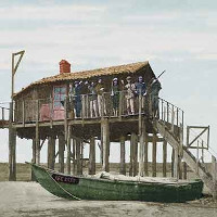 les CABANES TCHANQUEES, grandes maisons sur pilotis (les tchanques : les échasses) au milieu du Bassin, près de l'Ile aux Oiseaux.(1945/1948)