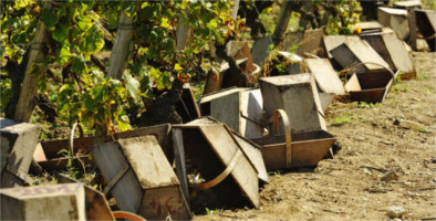 la BASTE : Une comporte, que l'on remplit en y versant les raisins contenus dans le baillot. Elle est munie de deux anneaux de fer opposés à travers lesquels on glisse une barre pour le transport, par deux hommes, jusqu'à la charrette, au bout des rangs (les règes). Voir le chai, les ciseaux, les cavaillons.